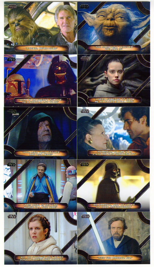 Description: 2018 Star Wars Galactic Files Chase Card Set Contents: (10) Memorable Quotes chase cards, MQ-1 through MQ-10 Manufacturer: Topps, 2...