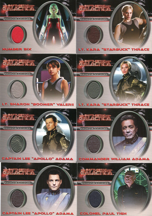 Description: Battlestar Galactica Premiere Edition Costume Card Set Contents: 8 costume cards with each card featuring an authentic piece of cos...