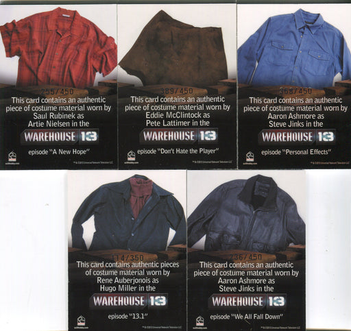 Description: Warehouse 13 Premium Packs Season 4 Costume Card Lot Contents: 5 authentic costume cards with each card featuring a piece of costum...