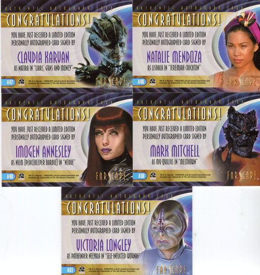 Description: Farscape Through the Wormhole Autograph Card Lot Contents: 5 authentic autograph cards, A47 through A51. Manufacturer: Rittenhous...