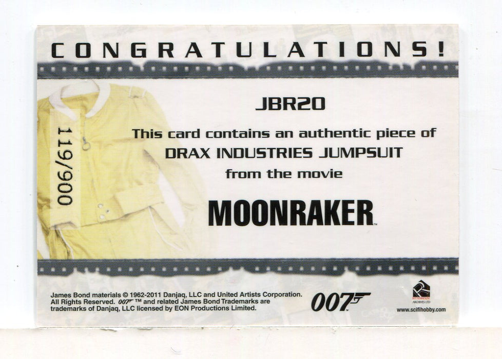 Contents:  Authentic limited edition relic/costume card JBR20 #119/900 featuring a piece of Drax Industries jumpsuit material worn in the film "Moonraker."