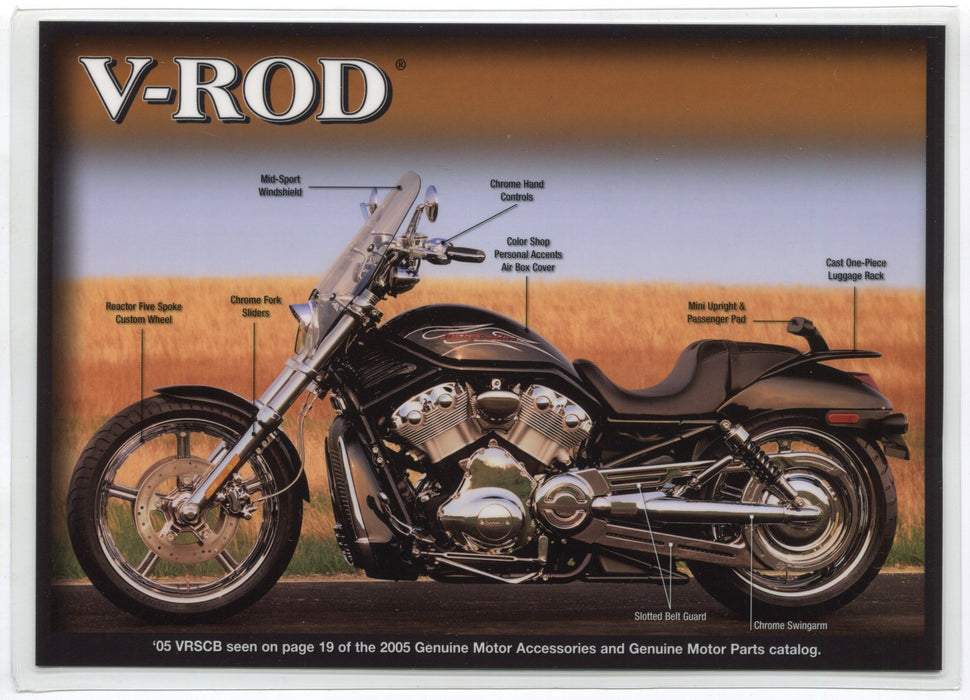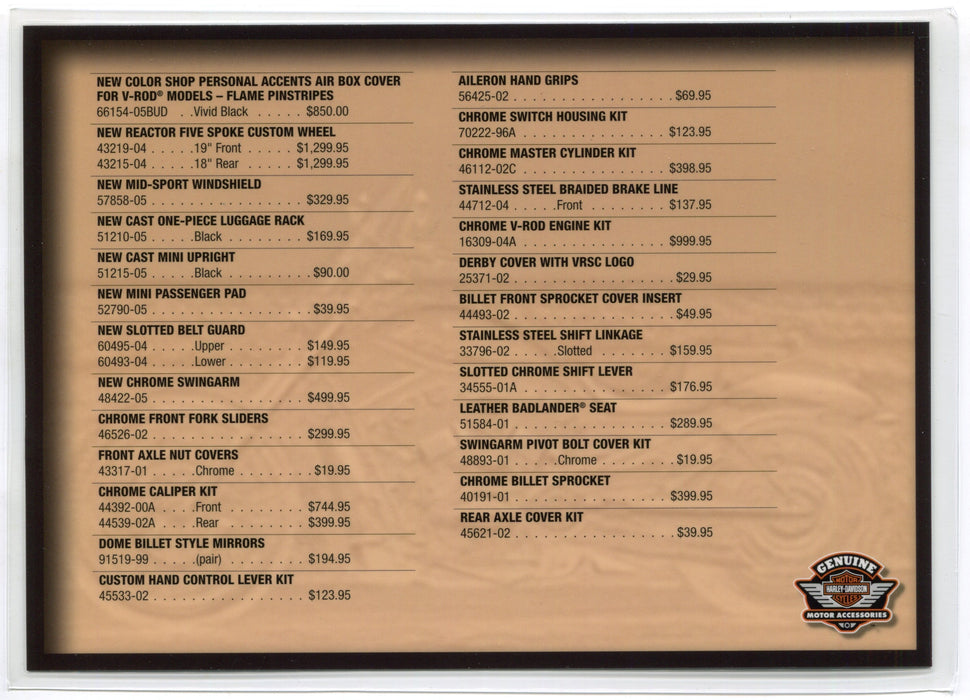 Product information: Harley Davidson Motorcycles Accessories Spec Sheet Dealer Card for the 2005 V-Rod Motorcycle. Shows all of the additional accessories that could have been purchased through the dealer on the back. Laminated card for dealership sales staff. Measures 5 1/4 by 7 1/4