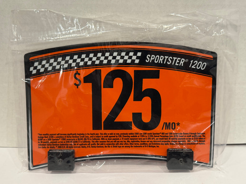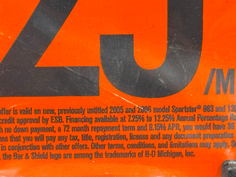 Product information: Harley Davidson Dealership Sales Promotion / Financing Sign for use on new Harley Davidson Sportsters on the dealership floor. They were used to promote Special pricing for the 2005 and 2006 models. They were designed to fit on the front fenders and are attached with magnets. Signs are double sided.