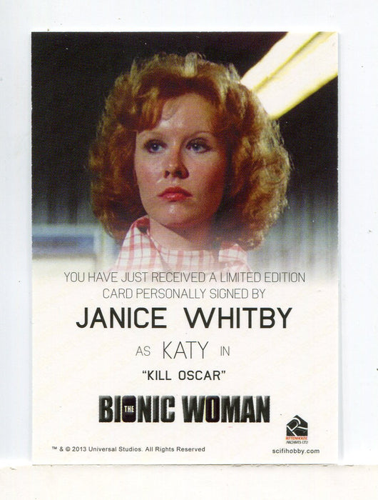 Contents: Authentic autograph card featuring Janice Whitby as Katy in The Bionic Woman episode "Kill Oscar."
