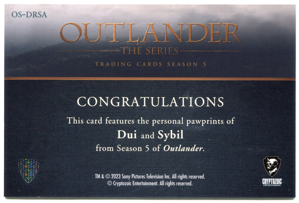 Contents: (1) Pawtograph. This card features the personal pawprint of Dui and Sybil from Season 5 of Outlander. Card is an oversized sized card (4 inches by 6 inches), numbered OS-DRSA, 20/25. Very rare only a few were produced.